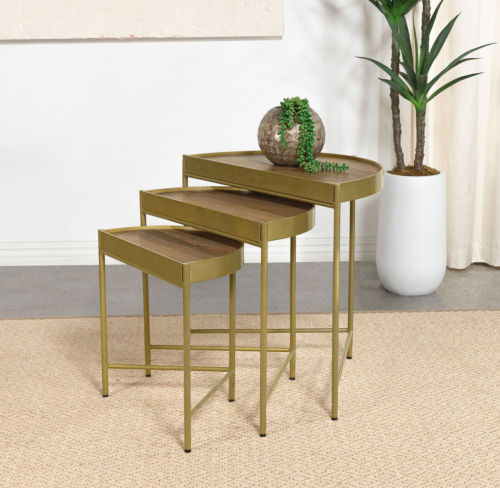 A classic example of yesteryear décor flaunts a retro aesthetic and a charming addition to casual living spaces. A clever configuration fits three separate pieces into this three-piece nesting table you’ll want to bring home. Convenience and aesthetics go hand in hand with tables featuring brown finished half-moon shaped eco-friendly mango wood tabletops set over chic angled frames made of gold finished iron frames. True square edges on each tabletop add extra dimensional impact. These tables arrange separately, placed close together, or nestled as a one-table look between usage. Key Features: • Retro aesthetic perfect for casual living spaces • Three-piece nesting table for versatile configurations • Brown finished, half-moon shaped mango wood tabletops • Chic angled frames in gold finished iron • True square edges for added dimensional impact
