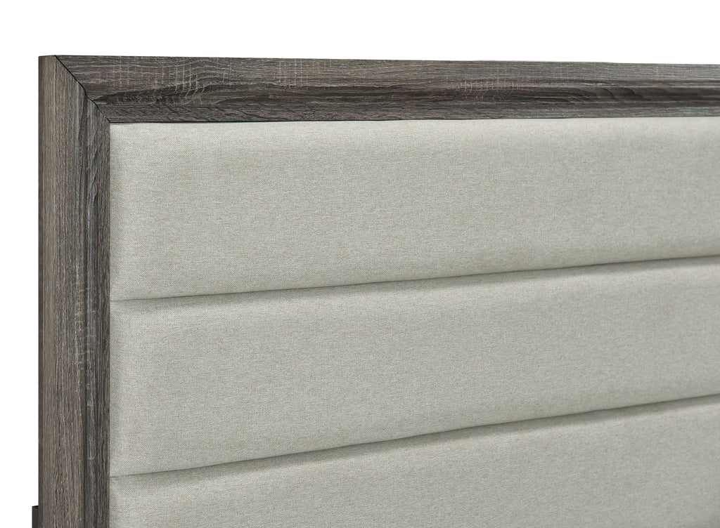 Introduce refined style in an approachable bedroom ensemble with this transitional wooden bed. With an upholstered headboard, it delivers impeccable comfort for lounging and relaxation. A brown oak wood grain finish pairs with laminate, delivering the perfect blend of style and durability. Tan fabric pairs with foam cushioning, delivering a complementary color tone that remains neutral in your bedroom. The bed features a tall headboard paired with a low footboard, creating an open, airy profile. Key Features: • Crisp style enhances the clean lines of a transitional wooden queen bed with an upholstered headboard • A brown oak wood grain finish is achieved with paper laminate, resisting daily wear and tear • Padded headboard is augmented with foam and covered in tan fabric for an appealing neutral look • Made from engineered wood with support legs at the center for excellent strength and durability • Support legs feature levelers to create stability on any flooring surface